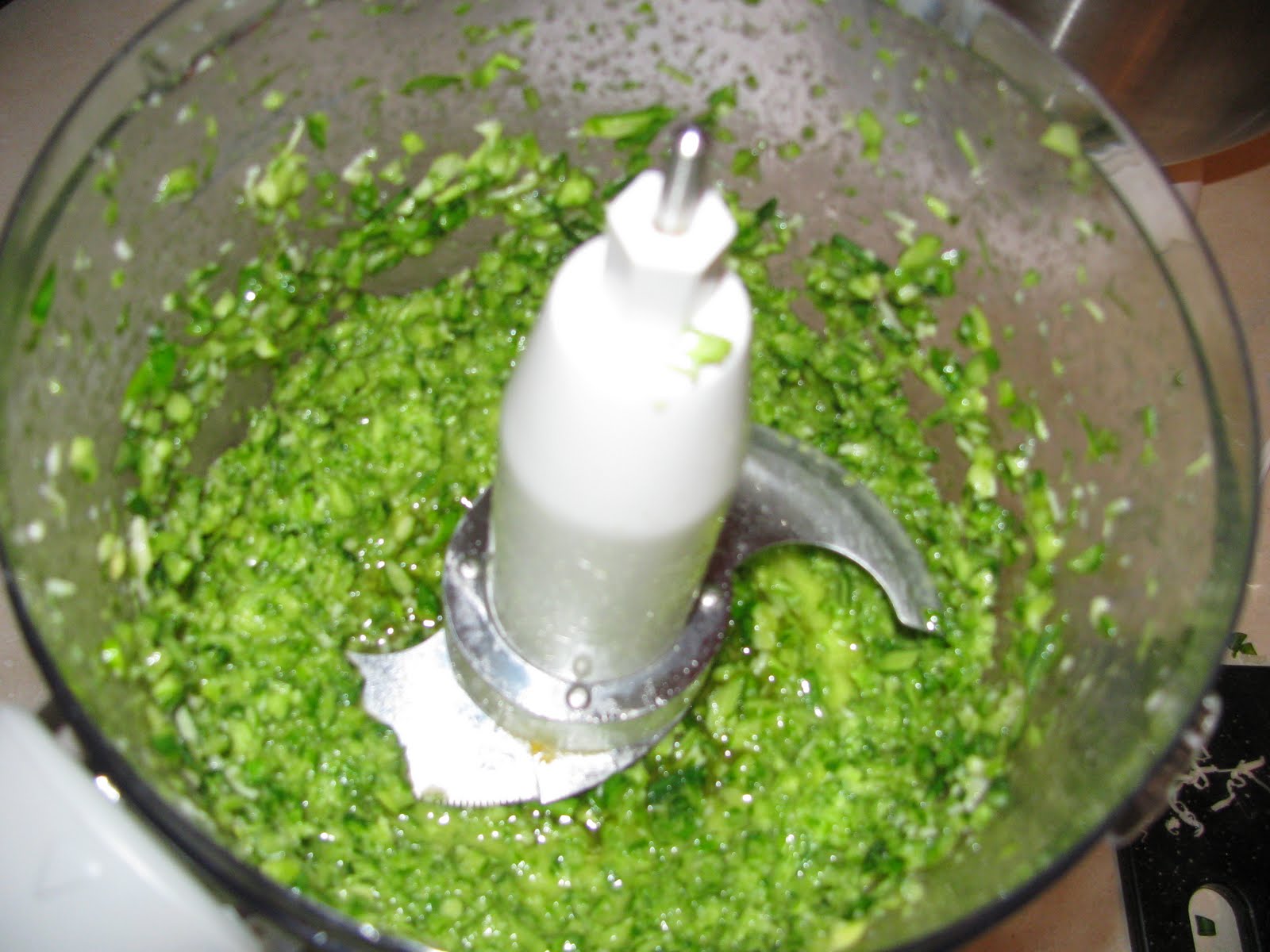 I chopped up the garlic scapes. Then, I spun them through the food processor with a little shredded cheese and olive oil to make a pesto sauce.